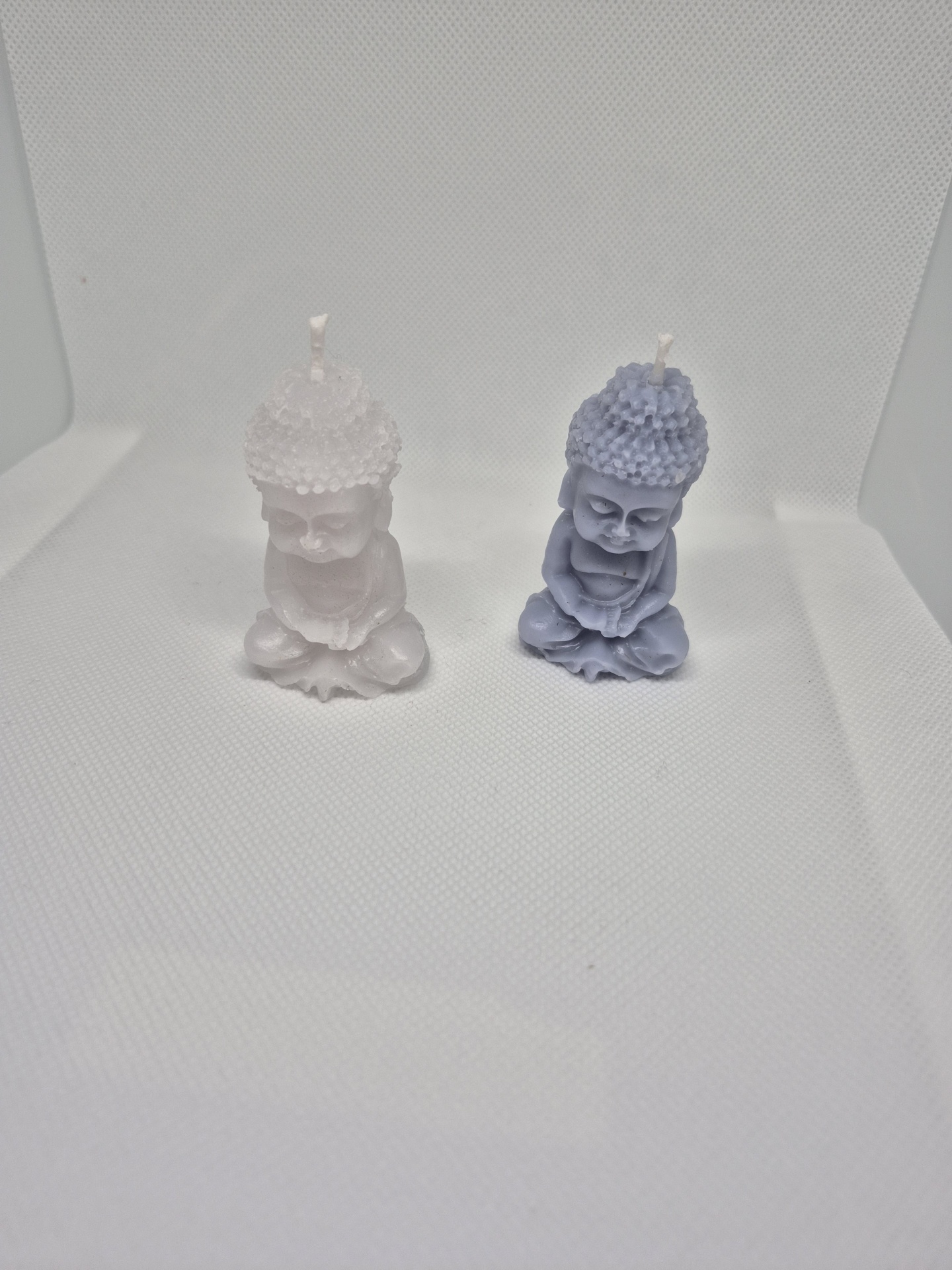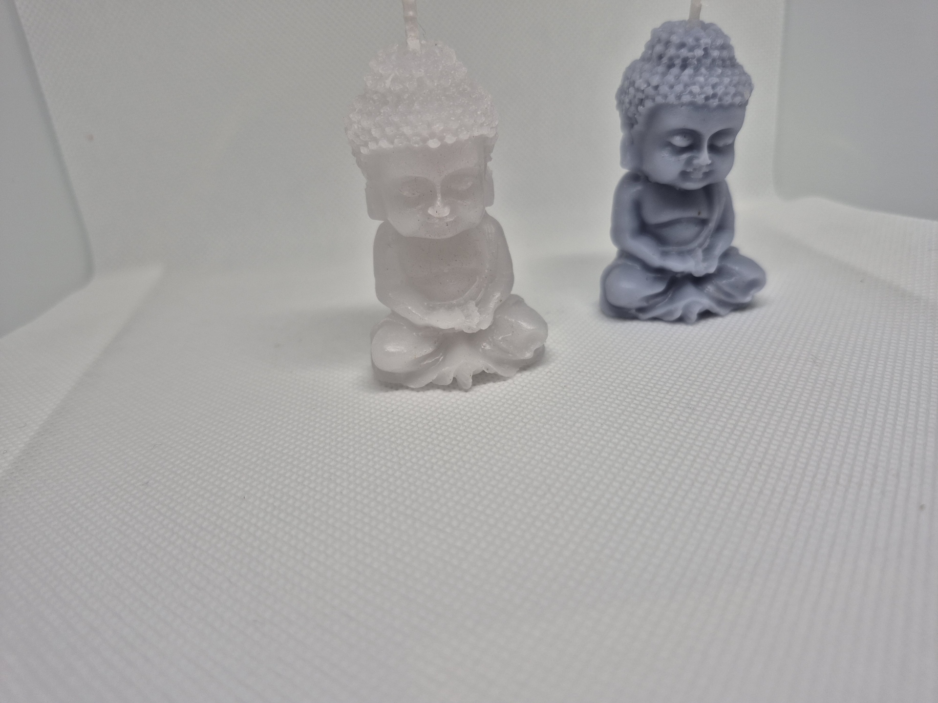 Duas velas em forma de Buda, branca e azul claro, em fundo branco texturado.