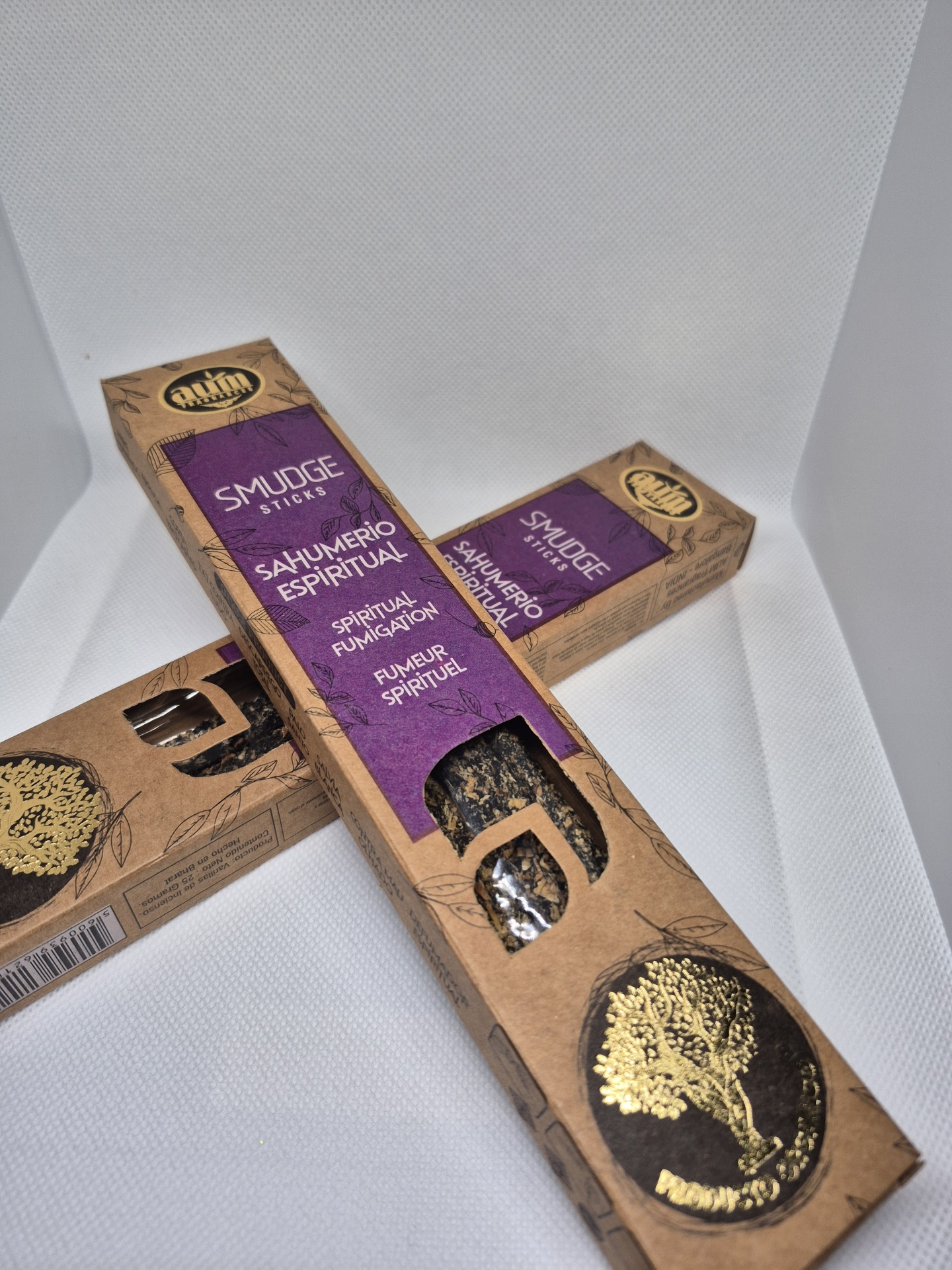 Caixas de incenso Aflam com etiquetas roxas e imagem dourada de árvore em fundo branco
