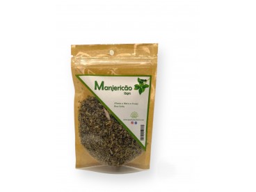Saco com manjericão seco e etiqueta branca com texto em português