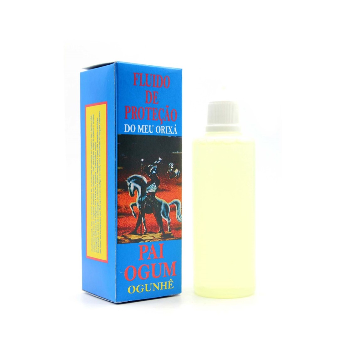Frasco com líquido amarelo ao lado de caixa azul com texto e ilustração de cavalo com cavaleiro