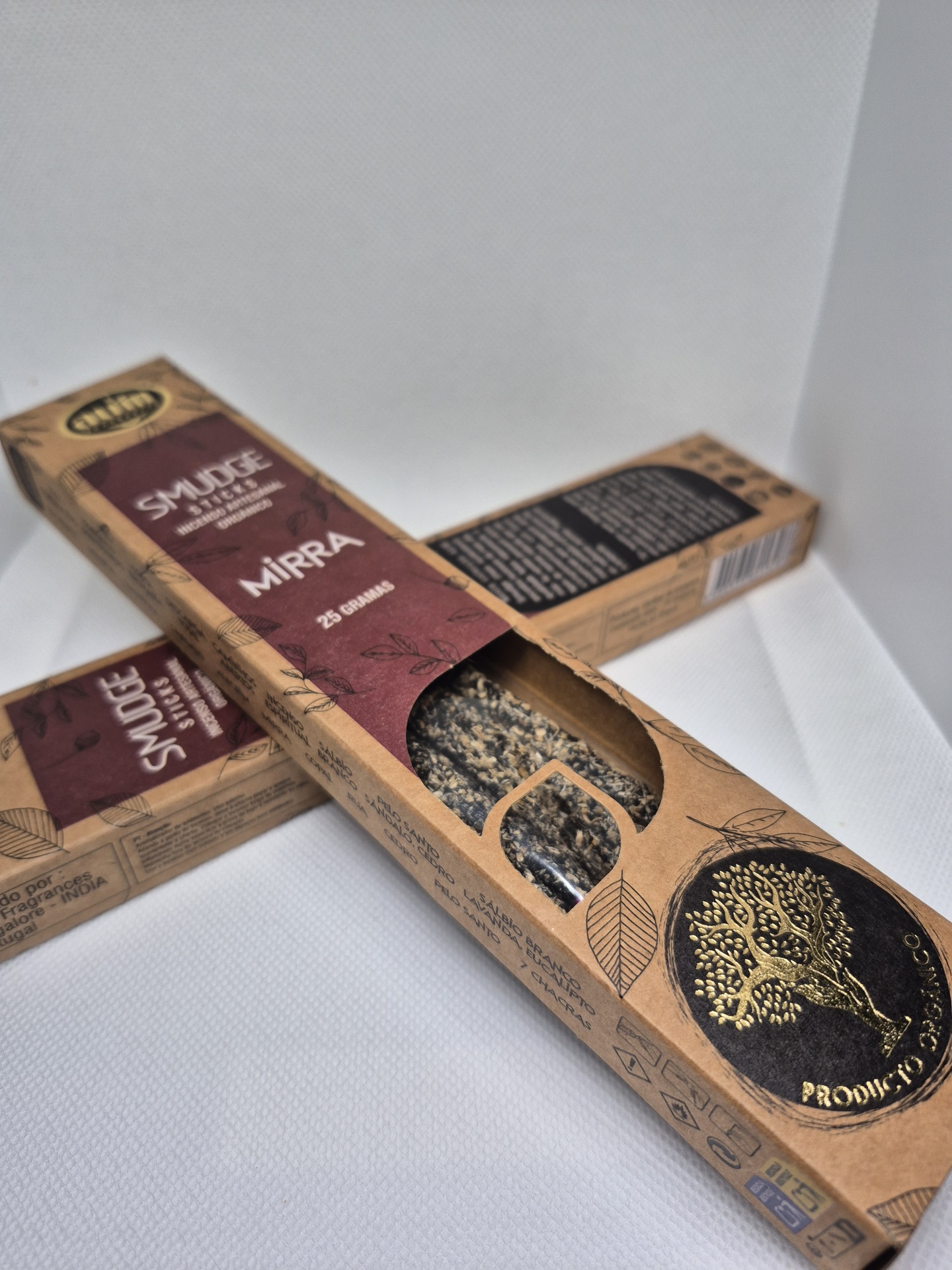 Embalagens marrons de incenso Smudge Mirra com design de árvore dourada
