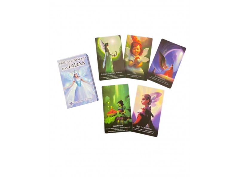 Cartas ilustradas com fadas e texto em português sobre fundo branco.