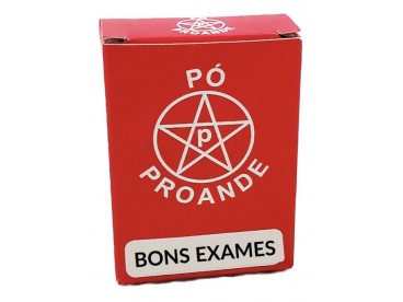 Embalagem vermelha com pentagrama branco e texto 'PÓ PROANDE BONS EXAMES'