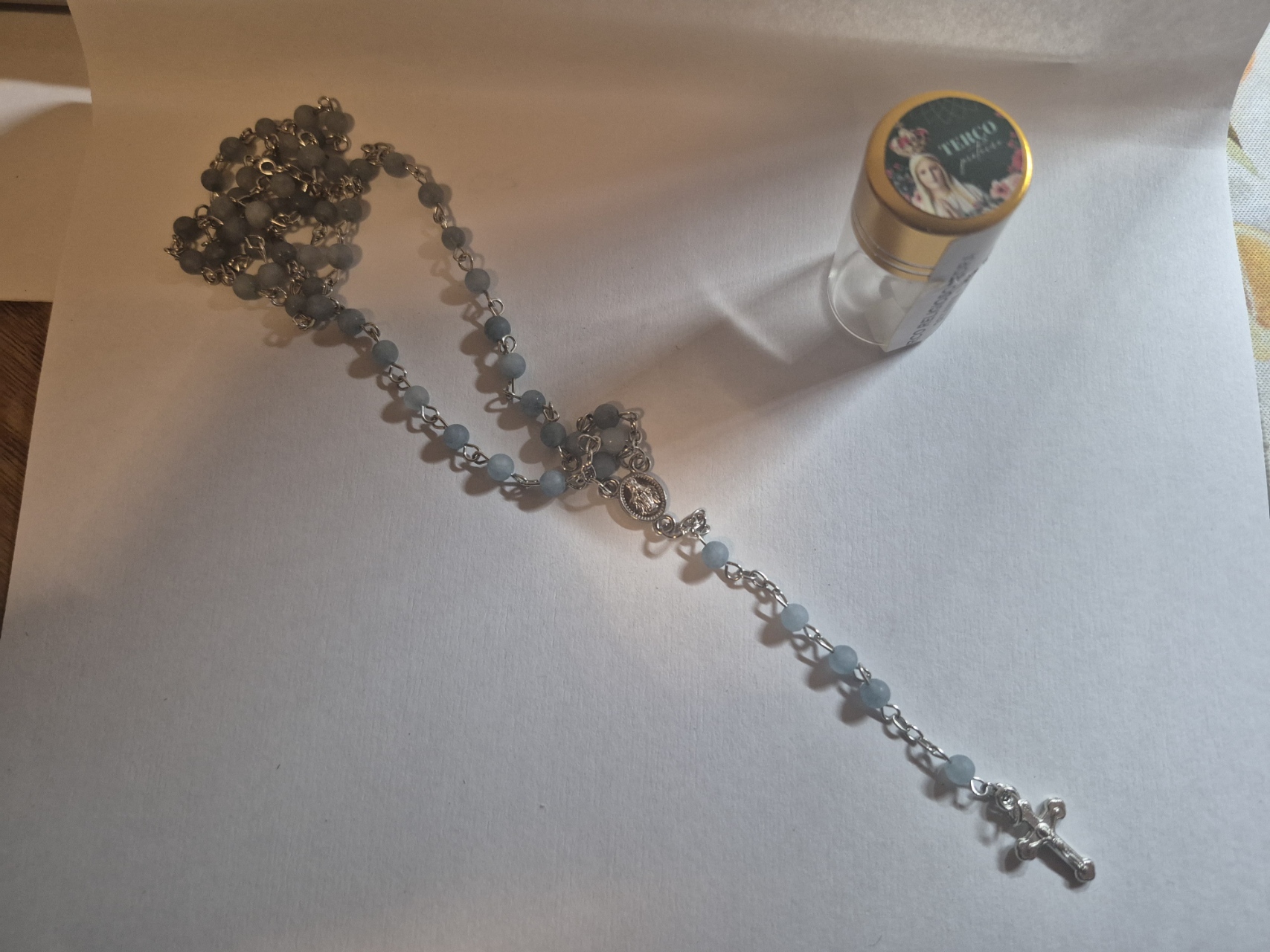 Terço transparente com crucifixo prateado e frasco com tampa dourada