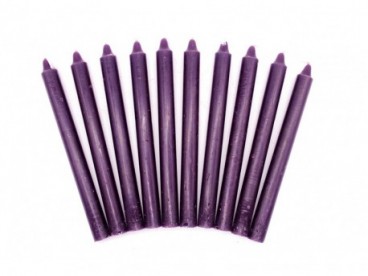 Dez velas roxas lisas dispostas em leque sobre fundo branco.