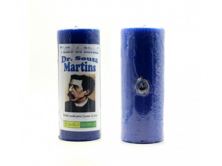Duas velas azuis cilíndricas, uma com rótulo branco e texto Dr. Sousa Martins