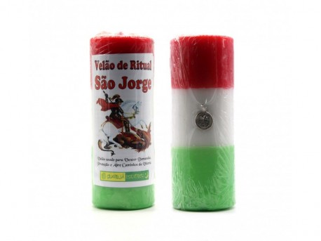 Velas de ritual São Jorge em vermelho, branco e verde, uma com etiqueta ilustrada e texto.